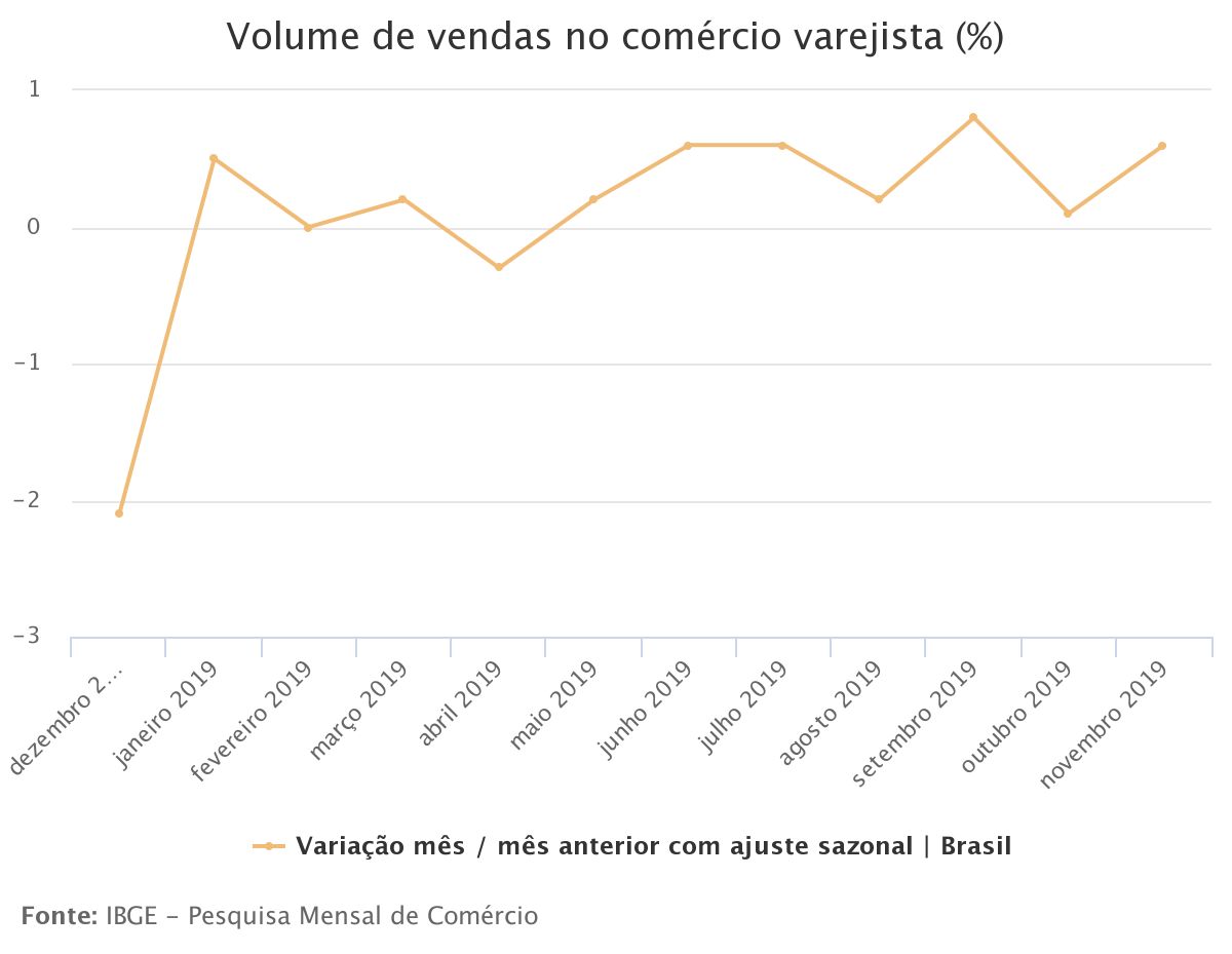 Agência IBGE — As vendas do comércio varejista cresceram 0,6% em novembro de 2019, na comparação com outubro, impulsionadas pelas promoções da Black Friday. Segundo a Pesquisa Mensal de Comércio, divulgada hoje pelo IBGE, foi o sétimo resultado positivo seguido do setor, com ganho acumulado de 3,3% no período.