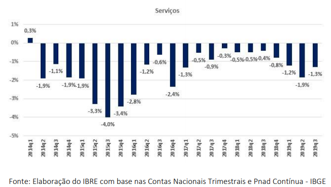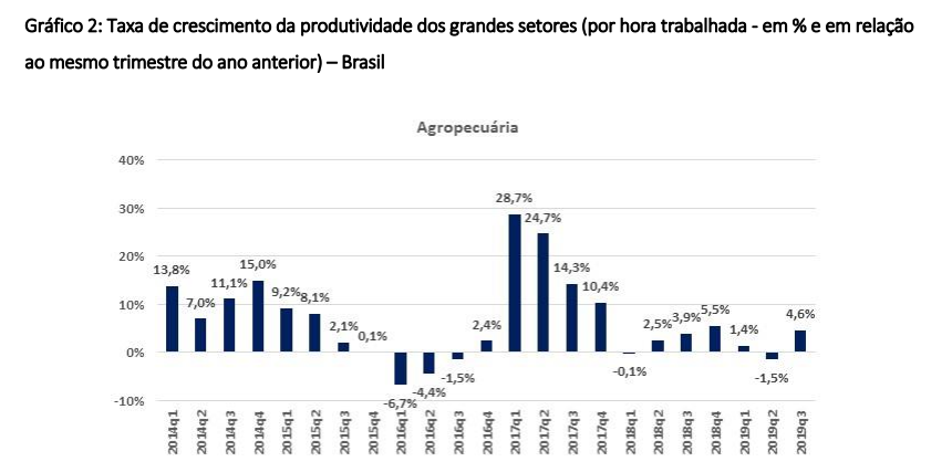 Um estudo recente da Secretaria de Política Econômica (SPE) do Ministério da Economia, publicado no Boletim MacroFiscal de janeiro de 2020, chegou a resultados que apontam na mesma direção. O texto faz uma decomposição da variação da produtividade do trabalho entre o terceiro trimestre de 2013 e o terceiro trimestre de 2019, com base em 3 componentes. O primeiro diz respeito a mudanças na alocação da população ocupada entre diferentes setores da economia, como, por exemplo, entre a indústria de transformação e o setor de serviços. O segundo se refere a realocações da população ocupada entre atividades formais e informais dentro de cada setor, como, por exemplo, o aumento da informalidade no setor de transportes. Já o terceiro componente mensura as variações da produtividade no âmbito de cada setor e categoria formal/informal, como a variação da produtividade das empresas formais da indústria de transformação.