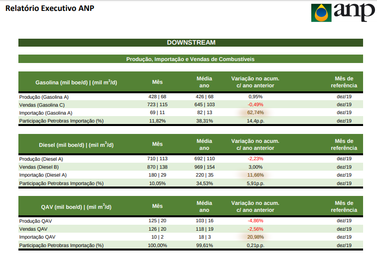 Segundo o último Relatório Executivo da ANP, publicação mensal estatística com números de produção e comércio exterior de petróleo e derivados, a importação brasileira de Gasolina tipo A (o tipo principal usado pelos carros brasileiros) em 2019 cresceu 63% em relação ao ano anterior, atingindo uma média de 82 mil barris por dia.