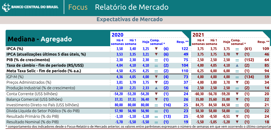 A tabela abaixo, extraída do Boletim Focus de hoje, se relaciona com os números acima na parte que trata da Conta Corrente (balança de pagamentos): segundo o Focus a Conta Corrente do Brasil deverá fechar 2020 com déficit de US$ 54,20 bilhões; para 2021, a estimativa é de um déficit de US$ 59 bilhões.