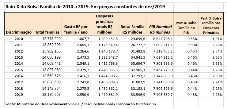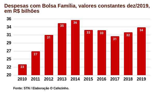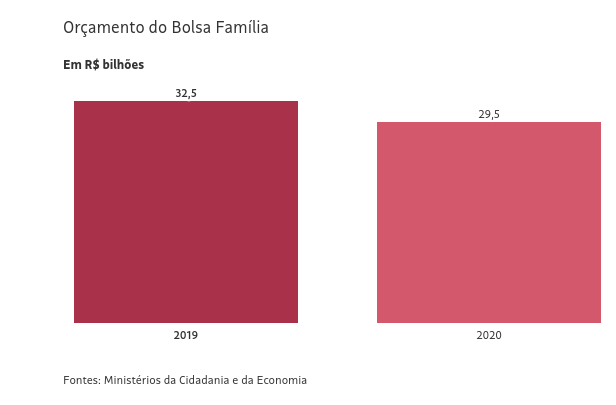 * Em valores correntes, os gastos do Bolsa Família em 2019 ficaram em R$ 32,9 bilhões. Em valores constantes de dezembro de 2019, estes aumentam para R$ 33,5 bilhões.