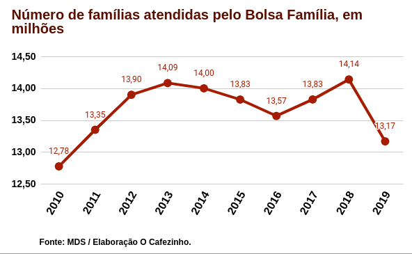 Em 2019, o número de famílias atendidas pelo programa foi de 13,17 milhões, o menor desde 2011. Considerando o desemprego e a crise econômica dos últimos anos, explica-se a quantidade crescente de pessoas aguardando na fila do programa.