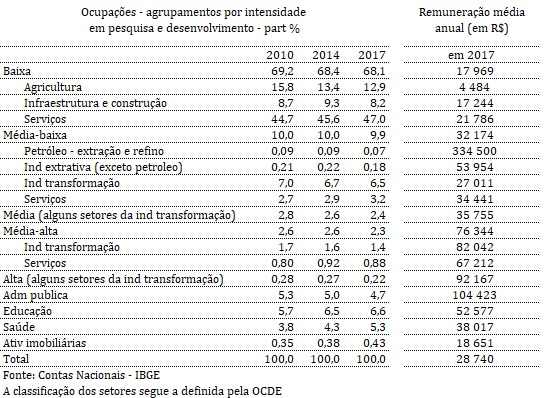 Vamos conferir então o que configura, realmente, uma má alocação de recursos. A tabela abaixo mostra a evolução da participação percentual de cada setor no total de ocupações (conceito mais amplo que emprego) no Brasil entre 2010 e 2017, e o valor da remuneração média anual em cada um destes setores em 2017 (como os dados são das Contas Nacionais, não é possível mostrar dados mais recentes). Nota-se claramente que praticamente metade das ocupações encontra-se nos setores de serviços de baixa intensidade tecnológica (seguindo a classificação da OCDE) e que praticam, por consequência, baixas remunerações. Além disso, a participação das ocupações nestes setores tem crescido. Em contrapartida, os setores mais dinâmicos da economia (indústria de transformação de média-alta e alta tecnologia e serviços modernos) exibem pequena participação na ocupação, e ainda por cima decrescente nos últimos anos.
