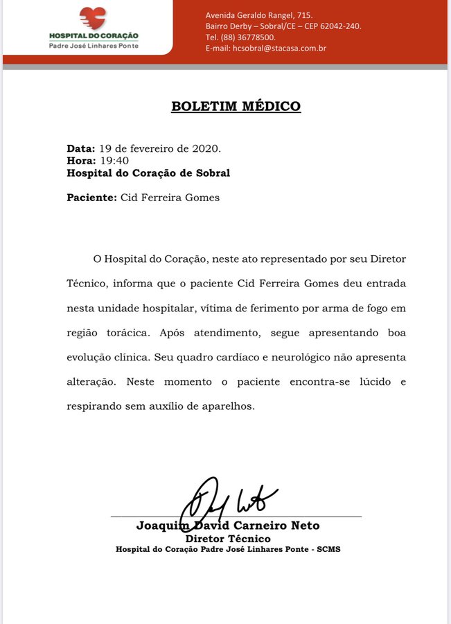 Atualização: Boletim Médico divulgado há pouco sobre o estado de saúde do senador.