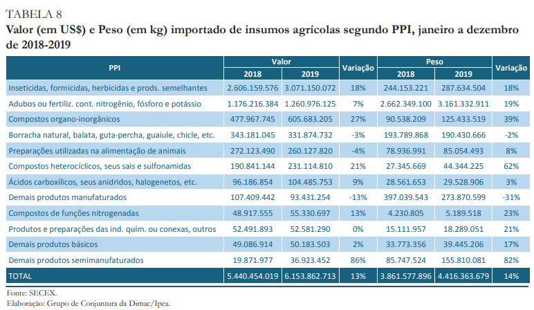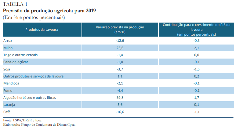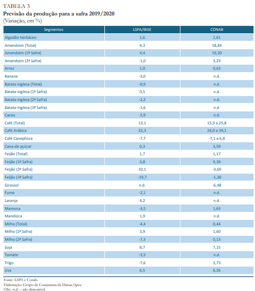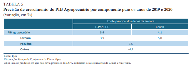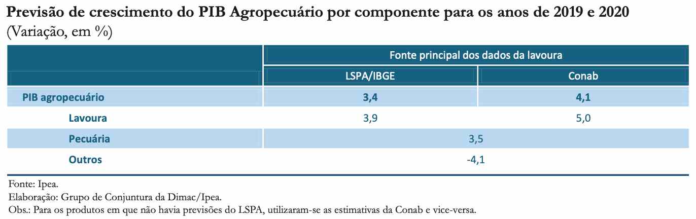 A seção de Economia Agrícola da Carta de Conjuntura do Instituto de Pesquisa Econômica Aplicada (Ipea), divulgada nesta sexta-feira, 21, prevê crescimento do produto interno bruto (PIB) do setor agropecuário para 2020: alta de 3,4% (com o prognóstico de safra utilizada pelo Instituto Brasileiro de Geografia e Estatística – IBGE) e de 4,1% (com o prognóstico de safra da Companhia Nacional de Abastecimento – Conab). Os pesquisadores reviram as previsões para cima, uma vez que a estimativa anterior era de crescimento de 3,2% e 3,7%, respectivamente.