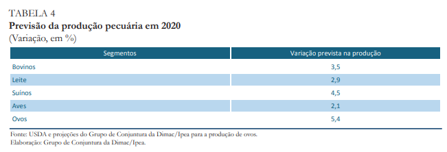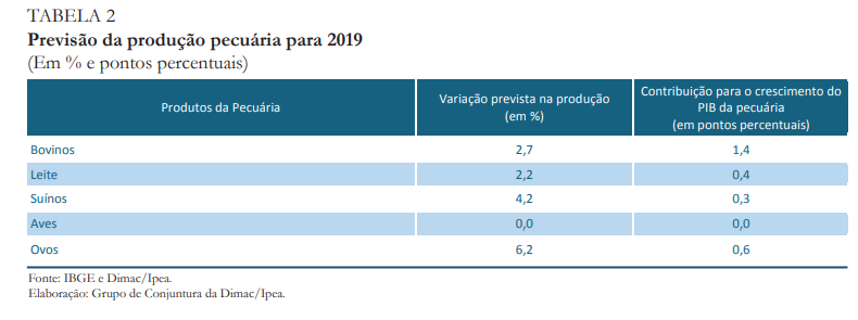 No caso da pecuária, todos os componentes devem impulsionar o crescimento do valor adicionado, com destaque positivo para a produção de suínos, com projeção de alta de 4,5% neste ano. Os pesquisadores do Ipea também utilizaram nas análises as previsões de volume de produção do Departamento de Agricultura dos Estados Unidos (USDA) para a pecuária.