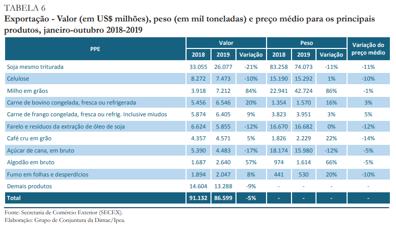 O Brasil é o maior exportador mundial de soja e as exportações brasileiras podem ser afetadas pelo recente acordo entre Estados Unidos e China, que prevê crescimento de 192% das importações de soja para a China em 2020 e de 258% em 2021 (na comparação com 2019). Porém a meta é inalcançável, uma vez que representaria um volume maior do que toda a soja produzida nos Estados Unidos nos dias atuais. Mas tudo indica que haverá uma grande pressão para ampliar as exportações norte-americanas para a China, deslocando os principais fornecedores. Por se tratar de uma commodity, é sempre possível realocar a oferta brasileira para outros mercados que deixariam de ser atendidos pela soja dos EUA (com todas as dificuldades de redefinições logísticas e contratuais envolvidas).