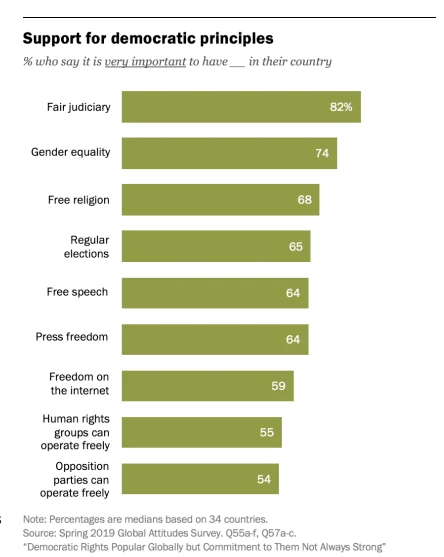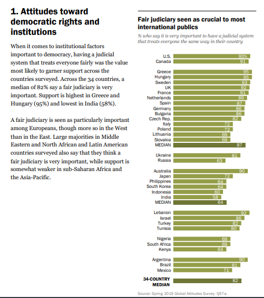 (…) Os nove direitos e instituições democráticos testados na pesquisa recebem níveis de apoio amplamente diferentes de públicos globais. A ideia de um judiciário justo é a mais vital – uma média de 82% diz que é muito importante e, dos nove itens testados, possui a maior porcentagem que a descreve como “muito importante” em 19 países (o segundo maior percentual em 10 países).