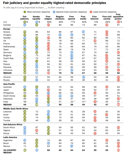 Trecho do texto divulgado junto com a pesquisa Pew, sobre o apoio às instituições e valores democráticos em 34 países: