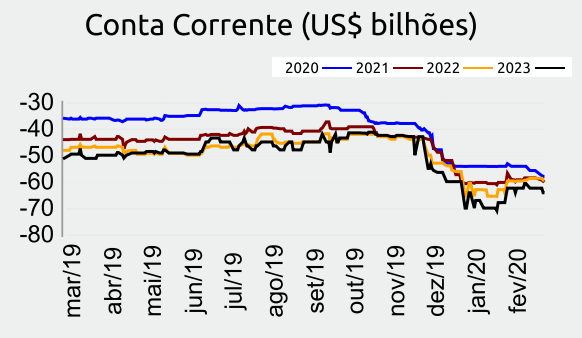 Entretanto, os números mais preocupantes se referem à balança de pagamentos (também chamada de conta corrente), onde se prevê um déficit de US$ 58 bilhões em 2020, um aumento de quase um bilhão e meio sobre a previsão da semana anterior. Para 2021, a projeção de déficit também foi reajustada para cima, e agora é se prevê US$ 59,4 bilhões; há um mês, a previsão de déficit para 2021 era de US$ 56,78 bilhões.