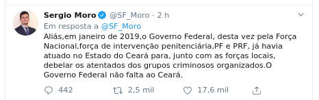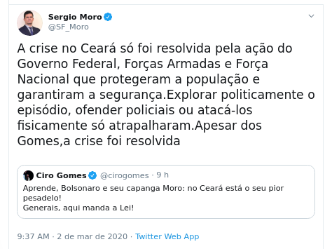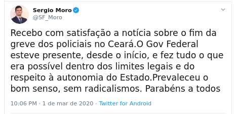 O segundo tweet é de um delinquente irresponsável, porque procura tirar qualquer mérito dos superiores hierárquicos da polícia militar cearense, saber, o governo do estado e a assembleia legislativa. Ao fazê-lo, mais uma vez Moro age como “capanga de miliciano”.