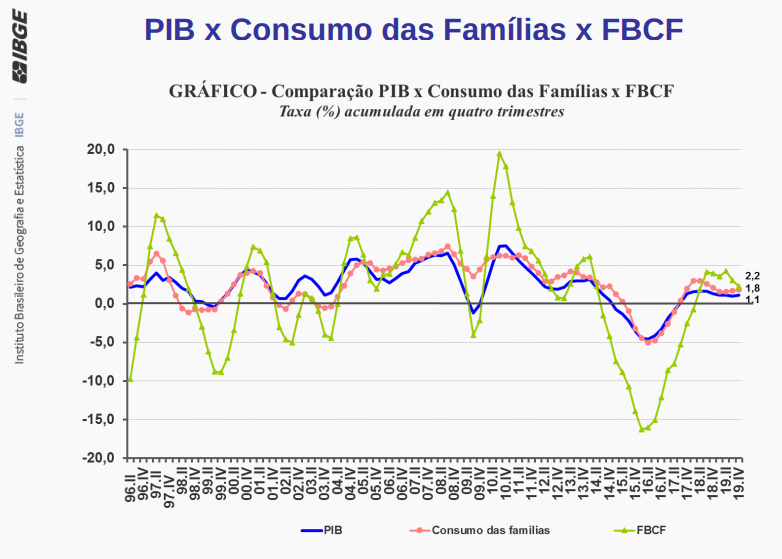 Agência IBGE — O Produto Interno Bruto (PIB), divulgado hoje pelo IBGE, fechou 2019 com crescimento de 1,1%, totalizando R$ 7.256,9 bilhões. Trata-se do terceiro resultado positivo, após as altas de 1,3% de 2017 e de 2018, que interromperam as quedas de 2015 e 2016. O PIB per capita variou 0,3%, em termos reais, alcançando R$ 34.533 em 2019.