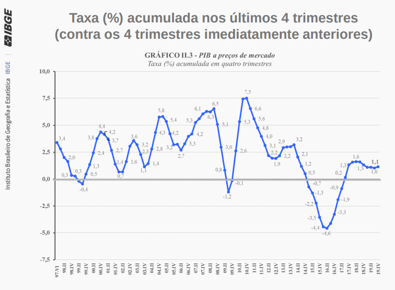 No quarto trimestre de 2019, o PIB avançou 0,5% na comparação com o terceiro trimestre do ano, registrando o nono resultado positivo consecutivo nesta comparação. Os serviços e a indústria tiveram variação positiva de 0,6% e 0,2%, respectivamente, enquanto a agropecuária recuou 0,4%. Quando comparado ao quarto trimestre de 2018, o PIB avançou 1,7%, no décimo segundo resultado positivo consecutivo, após onze trimestres de queda nesta base de comparação.