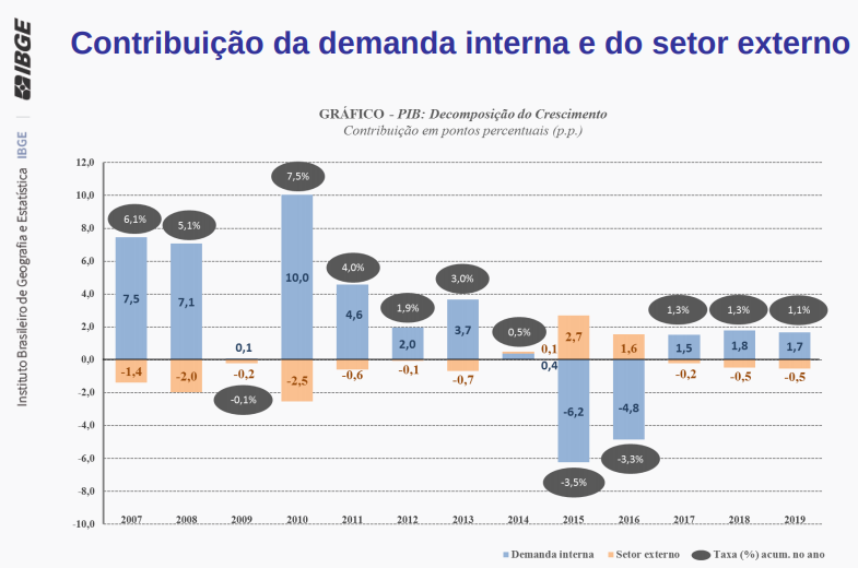 Ela esclarece que a inclusão dos dados do setor externo, que foram enviados com atraso no terceiro trimestre, não teve impacto no resultado do PIB em 2019. “Afetou apenas as exportações, pois o setor externo continuou contribuindo negativamente. Enquanto a demanda interna contribuiu com 1,7% do resultado, o setor externo apresentou queda de 0,5%”, explica Rebeca.