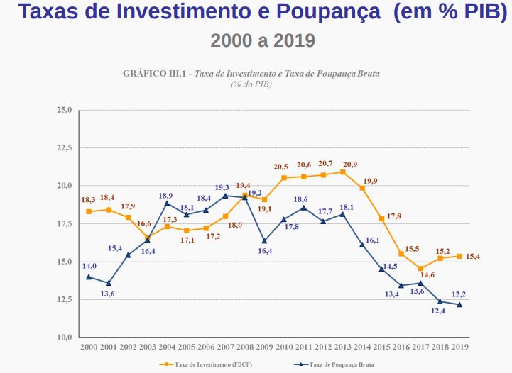 A taxa de investimento no ano de 2019 foi de 15,4% do PIB, ligeiramente acima do observado no ano anterior (15,2%). A taxa de poupança foi de 12,2% em 2019 (ante 12,4% em 2018). Entre os componentes da demanda interna, houve avanço no consumo das famílias (1,8%), e na formação bruta de capital fixo, em 2,2%. O consumo do governo recuou 0,4%.