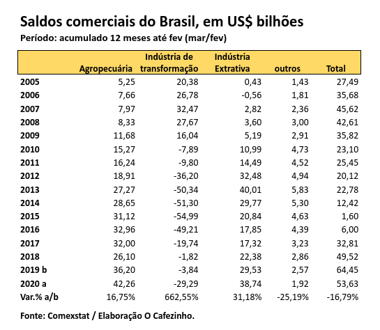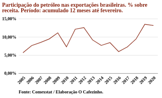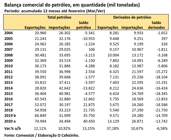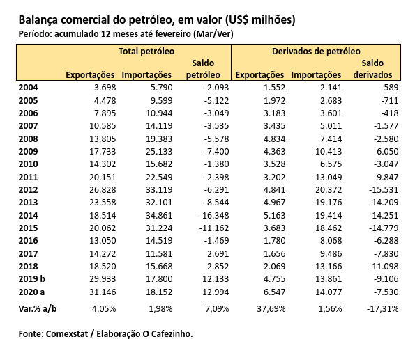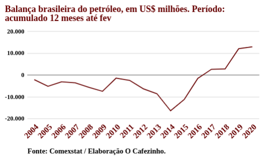 Essa piora da nossa balança vem na contramão do aumento dramático do saldo comercial do petróleo, que atingiu um novo recorde histórico no acumulado de 12 meses até fevereiro: US$ 12,9 bilhões.