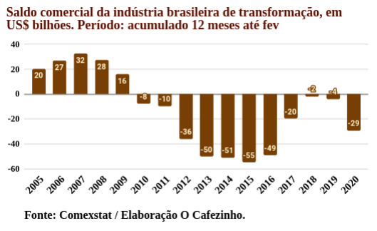 Considerando apenas a indústria de transformação, foi uma catástrofe: o saldo negativo do comércio exterior avançou quase 700% em relação ao ano anterior, e chegou a US$ 29 bilhões, o maior em quatro anos.