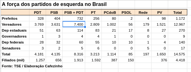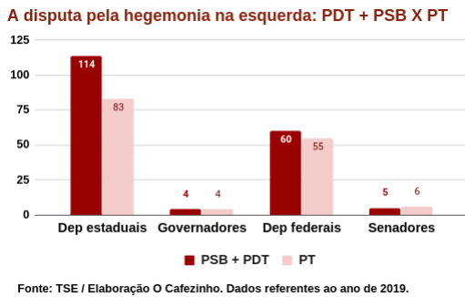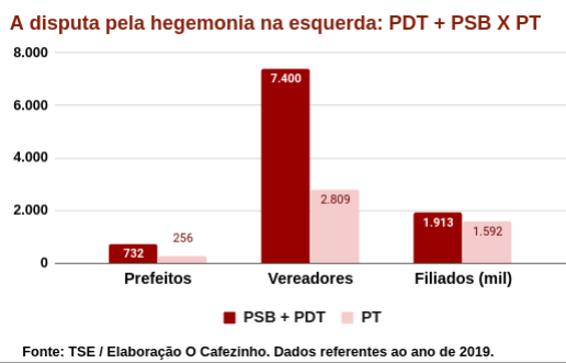 A verdade é a seguinte, somados PDT e PSB seria maior do que o PT, porém em qualquer votação na câmara federal, o PT tem todos os votos dos seus deputados, porém o PSD e PDT metade dos seus deputados votam com a direita, voto com BOSO. Mais ainda, em qualquer lugar do país, vereador, prefeito, governador, deputados do PT, são de fato PT, por outro lado, e na maioria dos estados esses mesmos do PSD e do PDT são políticos de direita. Veja em MT, MS, RS, SC, etc, etc, todos esses políticos desses partidos são de direita. Ninguém pode levar qualquer projeto de esquerda sem o PT, essa aliança será de direita.