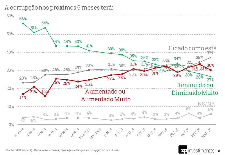 O gráfico com a expectativa sobre a corrupção também passou por enorme transformação nos últimos meses. Logo após a eleição presidencial, em novembro de 2018, havia uma grande esperança dos brasileiros de que a corrupão diminuiria. Não há mais. Hoje 67% dos brasileiros acham que a corrupção aumentará ou ficará como está, e apenas 27% que diminuirá.
