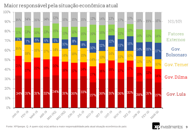 O percentual que atribui responsabilidade ao governo Bolsonaro pela situação econômica atual cresceu para 17%, o maior até agora. Mas ainda temos 41% dos entrevistados que ainda culpam os governos Lula e Dilma, em especial o governo Lula.