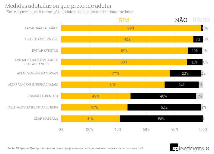 A população, ou pelo menos os entrevistados por essa pesquisa, está bastante consciente sobre as medidas a serem tomadas. 89% responderam que adotaram ou pretendem “evitar eventos”, ou seja, o contrário do que fez o presidente da república, no domingo 15.