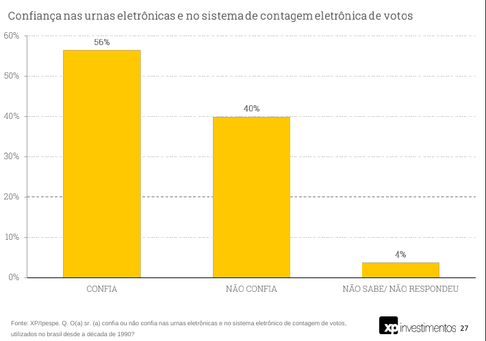 Por exemplo, a pesquisa mostra que a maioria da população, 56%, confia nas urnas eletrônicas e no sistema de contagem eletrônica dos votos. Este número deve ser contrastado à afirmação de Bolsonaro, de que “nenhum” brasileiro confiava no sistema eleitoral brasileiro, depois de lançar acusações gravíssimas contra o pleito de 2018, dizendo que tinha provas de fraude, provas estas que jamais trouxe à público (provavelmente, as “provas” são notícias do Terça-Livre publicadas na deepweb…).