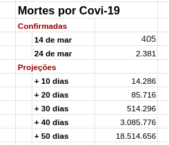 Se esse ritmo se mantiver, daqui a 10 dias, ou seja, por volta do dia 4 de abril, teremos saltados para 14,2 mil mortes por dia; em 20 dias, no dia 14 de abril, para 86 mil mortes por dia. Em 30 dias, teremos mais de 500 mil mortes por dia.