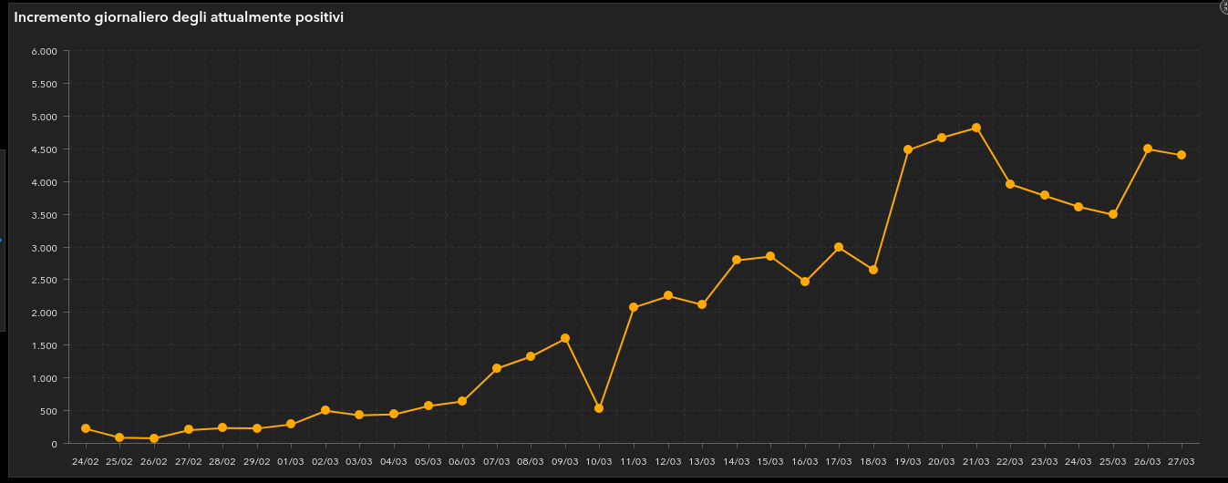 O gráfico abaixo corresponde à taxa de registros de “positivo” para Covid-19, na Itália. Observe que houve um declínio do dia 21 ao 25, seguido de uma alta.