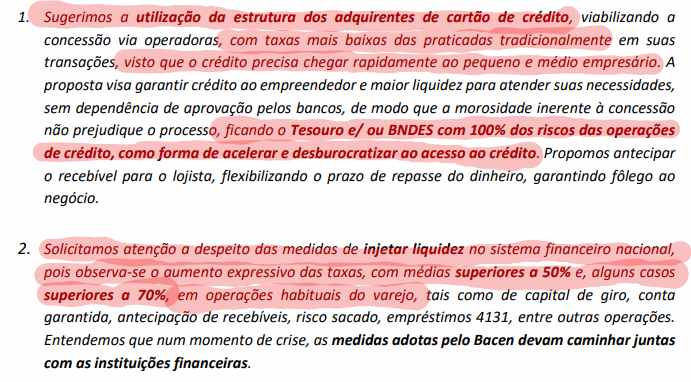 No documento direcionado ao Ministério da Economia, as entidades listam 9 medidas para mitigar os impactos econômicos na cadeia produtiva. Já na carta enviada ao Banco Central, são propostas 5 medidas para preservar a sobrevivência dos pequenos e médios varejistas.