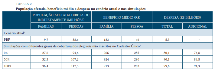 Em um cenário extremo, no qual o governo não consegue localizar ninguém que está fora do Cadastro Único (0%), serão beneficiadas direta ou indiretamente 27,6 milhões de famílias ou 93,6 milhões de pessoas, com gasto total estimado em R$ 80 bilhões. No cenário intermediário, onde seriam localizados 50% dos potenciais beneficiários fora do Cadastro, serão beneficiadas direta ou indiretamente 32,5, milhões de família ou 107,2 milhões de pessoas, com gasto total estimado em R$ 90,1 bilhões.