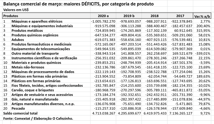 As categorias de produtos que mais causaram déficit em nossa balança comercial, ou seja, onde houve mais importação que exportação, foram, por ordem de importância: