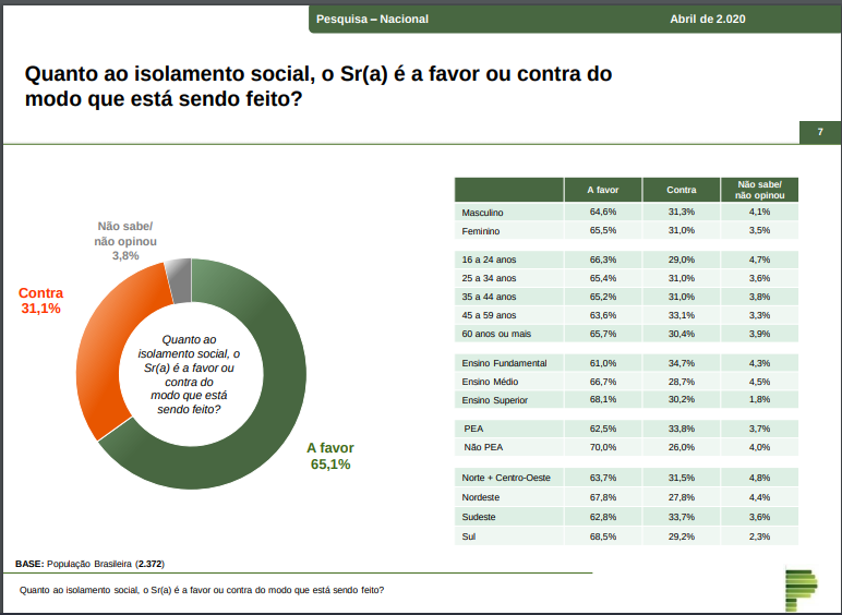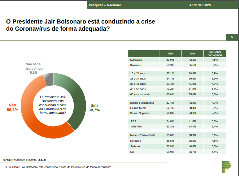 Uma pesquisa realizada pelo instituto Paraná Pesquisas, entre os dias 6 a 7 de abril, mostra que a maioria dos brasileiros (56%) acha que o presidente da república NÃO está conduzindo a crise do coronavírus de maneira adequada.