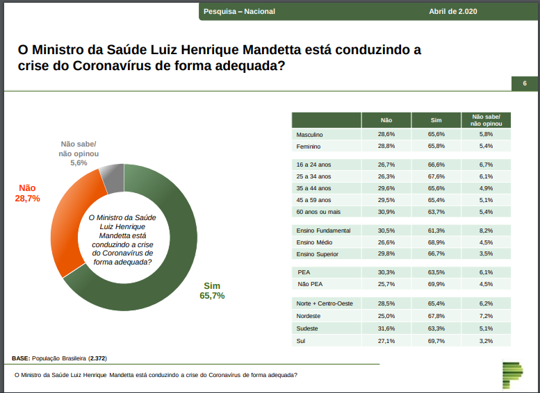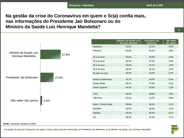 Houve um comparativo de confiança entre Mandetta e Bolsonaro, com a pergunta sobre quem o brasileiro “confia mais”: a maioria, 58%, afirmou que confia mais no ministro da Saúde.