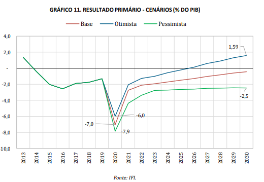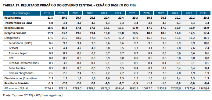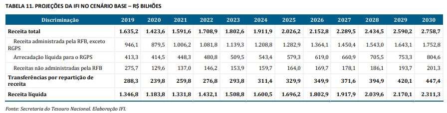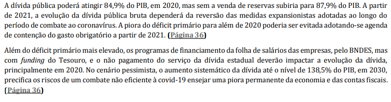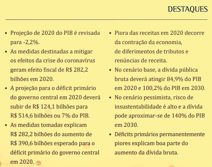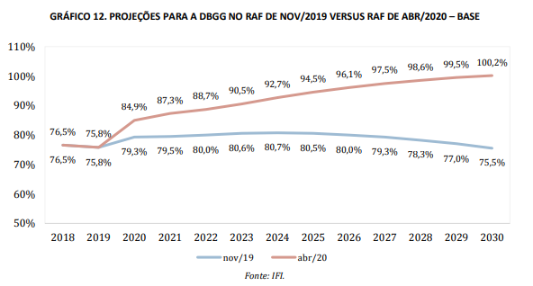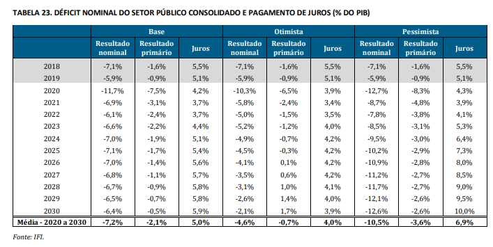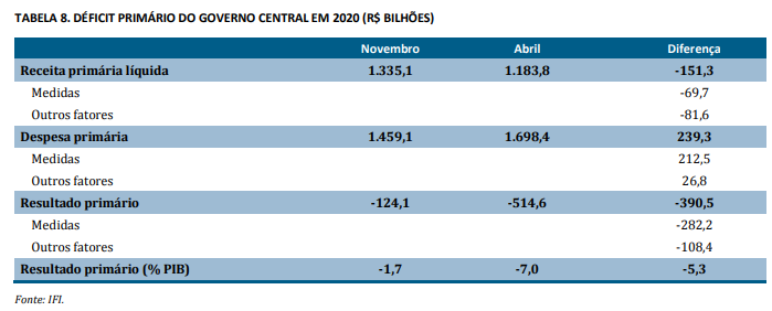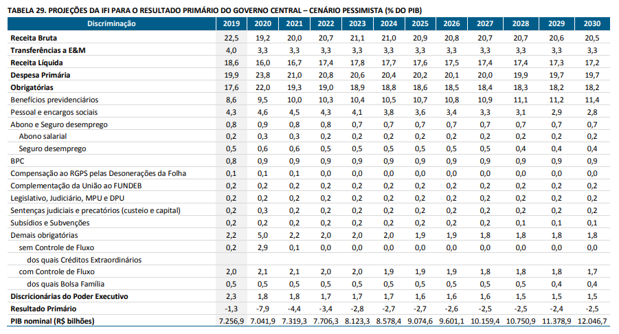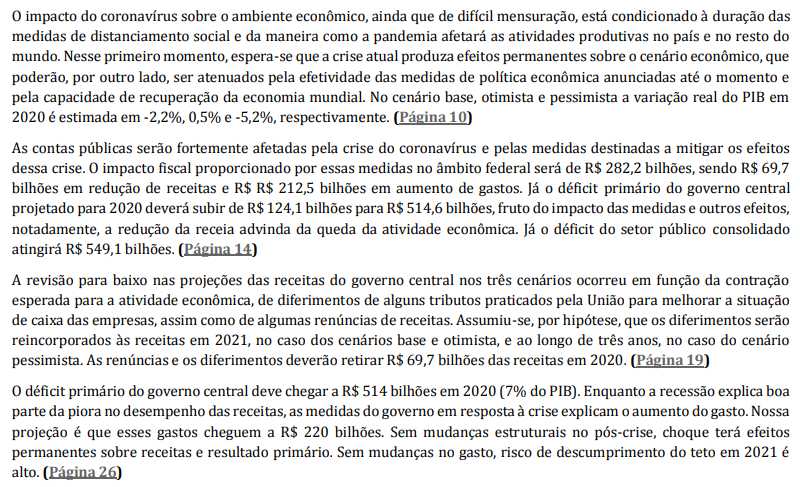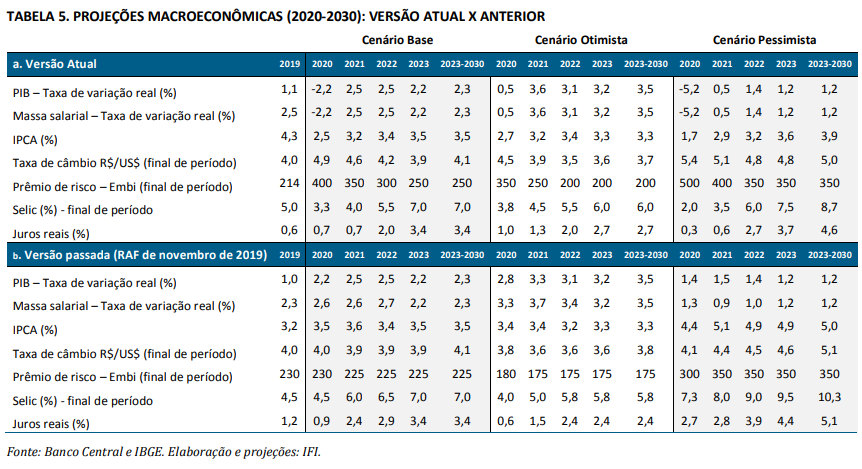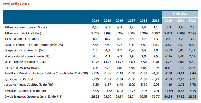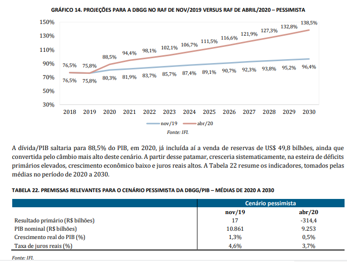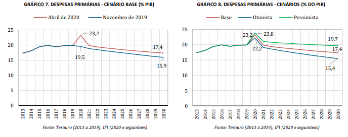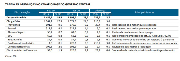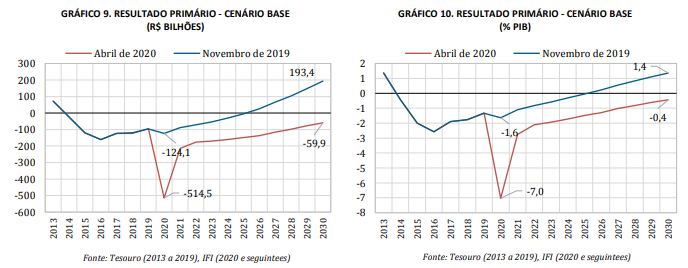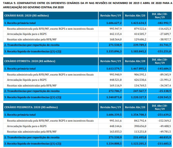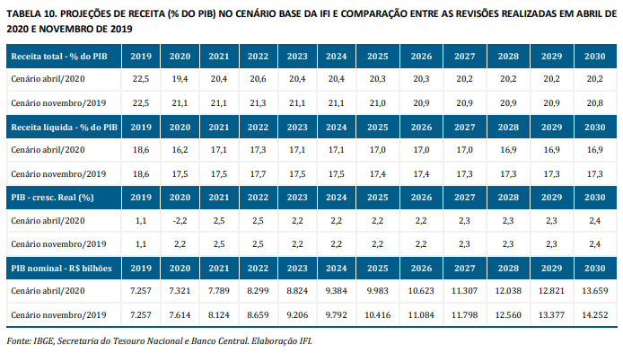 A Instituição Fiscal Independente, órgão vinculado ao Senado, divulgou ontem à noite a seu Relatório de Acompanhamento Fiscal de abril, onde se vê profundos reajustes nas previsões de receitas e despesas do governo para os próximos anos, em relação ao último documento, de novembro de 2019.