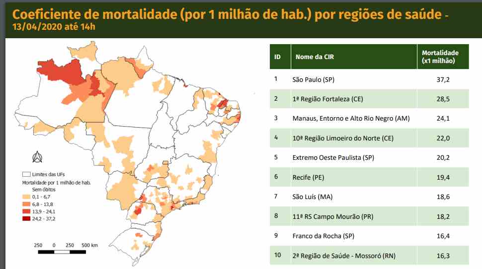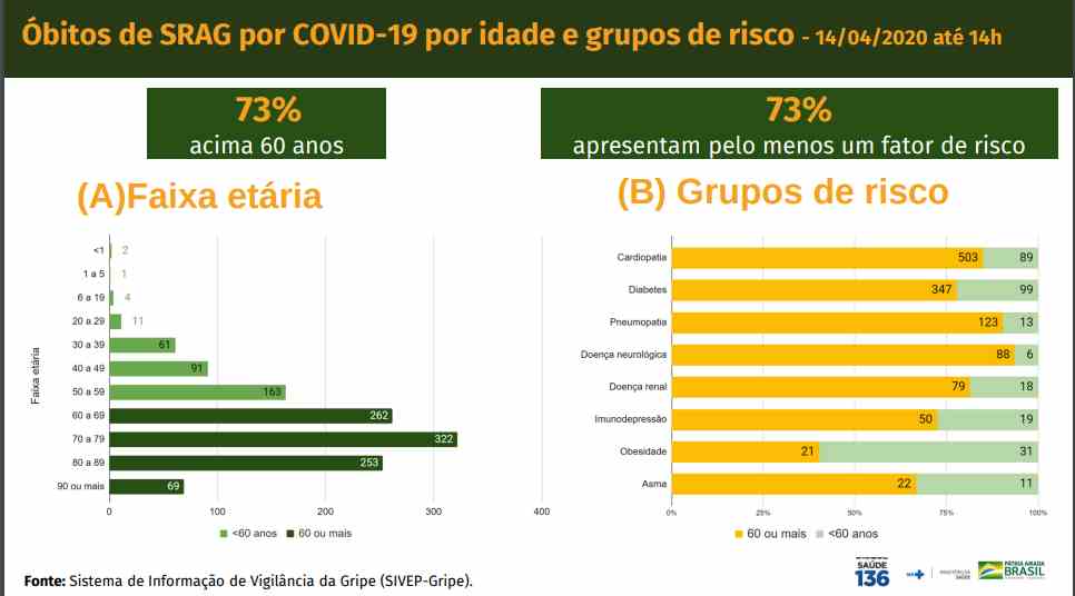 Do total de casos, 6.043 estão em estado grave, necessitando de internação em hospitais de referência em todo o Brasil. Atualmente, dos 1.532 óbitos confirmados, 73% ocorreram em pessoas com mais de 60 anos e 73% do total das vítimas apresentavam pelo menos um fator de risco.