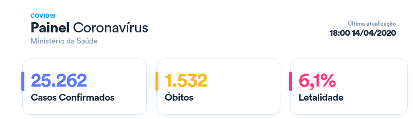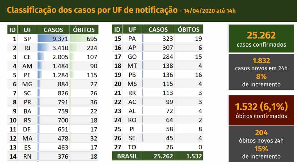 Agência Saúde — Subiu para 25.262 o número de casos confirmados de coronavírus no Brasil. Foram 1.832 novas confirmações em 24 horas. O número de óbitos também aumentou, agora são 1.532. Os números estão consolidados com as informações que foram repassadas pelas Secretarias Estaduais de Saúde ao Ministério da Saúde até às 14h desta terça-feira (14).