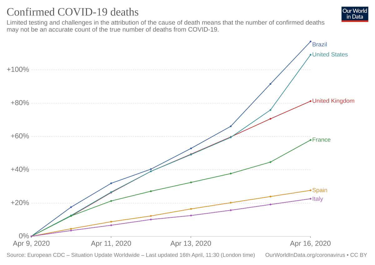 O Brasil assumiu o primeiro lugar desde o dia 2 de abril, o que significa que desde essa data, o crescimento do número de mortes por Covid no Brasil  tem se dado numa taxa superior a dos demais países. Até o dia 1 de abril, o primeiro lugar pertencia à Inglaterra.