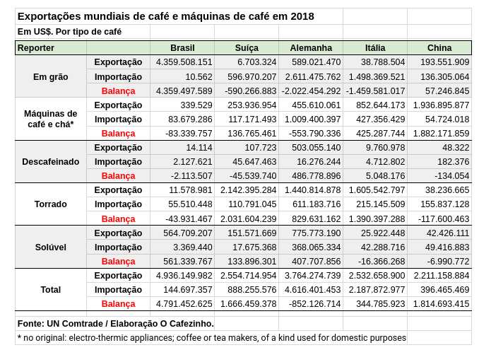 Outro fator importante de renda do setor cafeeiro é a indústria de máquinas de café, tanto de espresso como as normais: apenas a China exportou quase US$ 2 bilhões desses produtos em 2018.