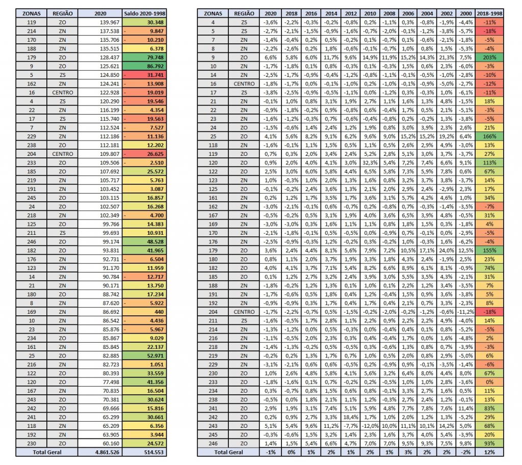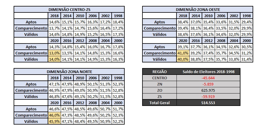 Em números absolutos de eleitores, o eixo Centro-Zona Sul foi a principal queda entre 2020 e 1998. Isso nos leva a crer que, cada vez mais, essas duas regiões vão perder espaço, principalmente nas localidades mais elitizadas. A Zona Norte perdeu bastante peso proporcional, mas não foi algo significativo em termos absolutos, ou seja, a principal causa da diminuição do tamanho proporcional foi o crescimento da Zona Oeste.