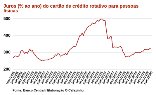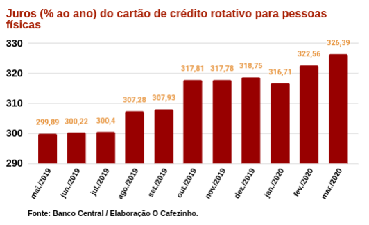 O Banco Central divulgou hoje que, em março, os juros do cartão de crédito rotativo para pessoas físicas subiu para 326,29% ao ano, o nível mais alto desde março de 2018.