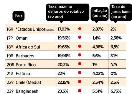 Agora, comparem esses juros com os praticados em outros países. A pesquisa mais recente é do instituto Proteste, com base em dados dos bancos centrais de diversos países, que foi objeto de uma reportagem do jornal Extra, de 26 de agosto de 2018. O infográfico é da matéria.