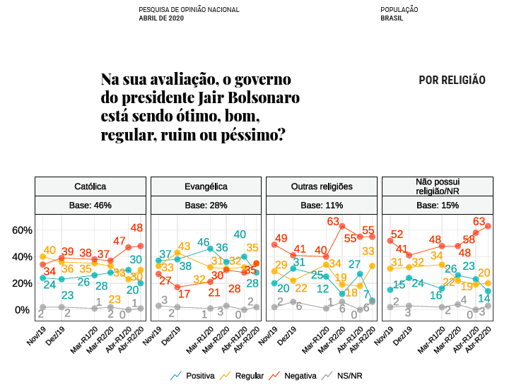 Bolsonaro perdeu apoio inclusive entre os evangélicos, que são o grupo onde ele ainda tem mais apoio: sua avaliação positiva neste grupo, que era de 40% há poucas semanas, caiu para 28%, ao passo que a negativa subiu de 28% para 35%.