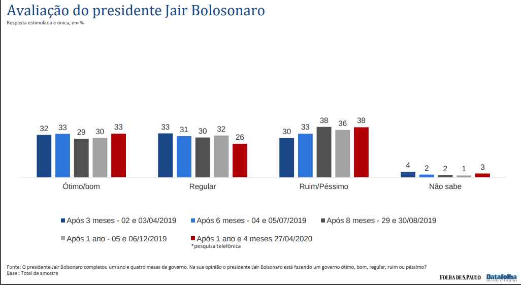 A aprovação geral de Bolsonaro se mantém estável desde abril do ano passado, com 33% de ótimo e bom e 38% de ruim e péssimo.
