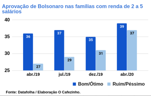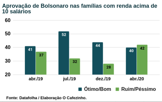A rejeição a Bolsonaro entre famílias de renda média, entre 5 e 10 salários, subiu para 40%. Este era o setor social que mais apoiava Bolsonaro no início de seu governo, e formava o núcleo duro de sua campanha eleitoral. Ele ainda tem o apoio de 33% desse eleitorado, contra 44% em dezembro do ano passado.