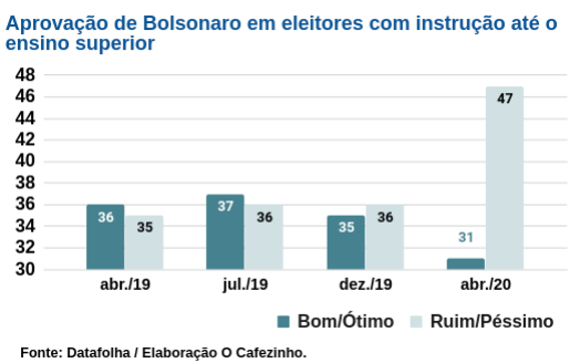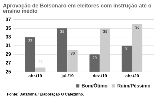 A aprovação de Bolsonaro junto às classes mais instruídas e de renda média continua a se deteriorar.