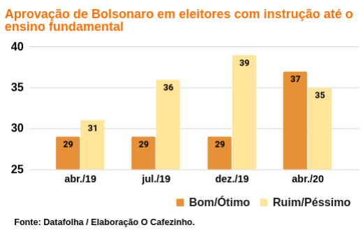 Conclusão: Bolsonaro ainda desfruta da força inercial que o levou à vitória eleitoral. Entretanto, a deterioração entre os eleitores mais instruídos é um sinal de que a “gravidade” já começa a fazer efeito sobre o presidente: a classe média é sempre um termômetro importante para saber para onde sopram os ventos, porque ela consome antes as informações que, mais tarde, chegam à população mais pobre. Aparentemente, Bolsonaro é beneficiado também por um fenômeno comum em momentos de guerra. O aumento da insegurança da população a leva a confiar mais no presidente, com esperança de receber auxílios. O pobre e o brasileiro pouco instruído ficam inseguros de responder à pesquisa que acham o governo ruim ou péssimo se contam, desesperadamente, com ajuda do governo para sobreviver nos próximos meses.