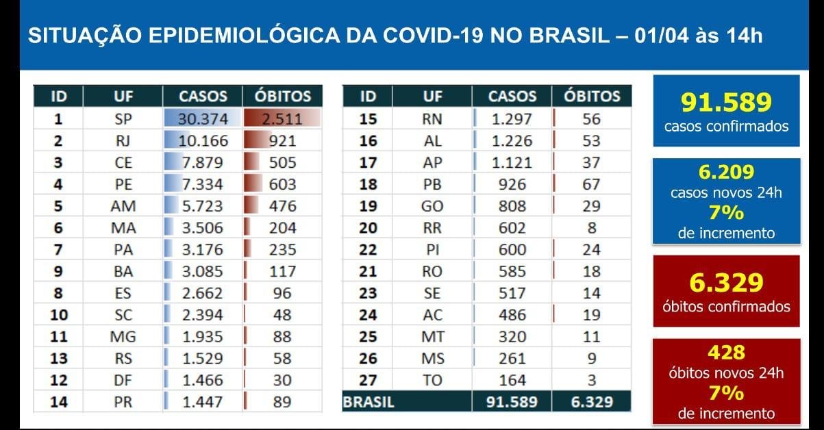 Agência Brasil — O Brasil chegou hoje (1º) a 91.589 pessoas infectadas por covid-19, doença respiratória causada pelo novo coronavírus. Em 24h, foram registrados no país 6.209 casos, um aumento de 7% em relação ao total de notificações de ontem (30), quando 85.380 pessoas testaram positivo para o vírus.