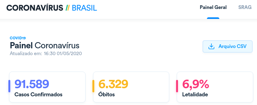 De acordo com a atualização do Ministério da Saúde divulgada nesta sexta-feira (1°), o total de mortes subiu para 6.329. De ontem para hoje, foram registrados 428 novos óbitos, um aumento de 7% em relação à quinta-feira (30), quando foram contabilizados 5.901 falecimentos.