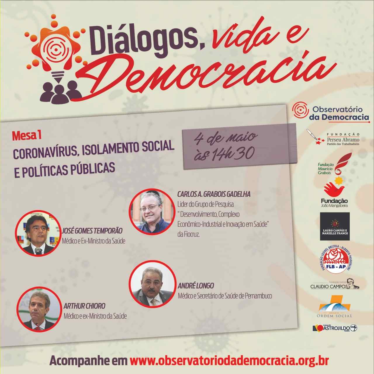 O Observatório da Democracia, fórum das fundações partidárias do PDT, PSB, PCdoB, PSOL, PPL, PT, PROS e Cidadania, realizará o ciclo de seminários virtuais “Diálogos, Vida e Democracia”. Entre os dias 4 de Maio e 15 de Julho, os debates vão tratar de propostas para enfrentar as múltiplas crises política, econômica e sanitária amplificadas pela pandemia do coronavírus que assola o Brasil. O ciclo tem caráter suprapartidário e agrega forças do campo democrático da política brasileira.