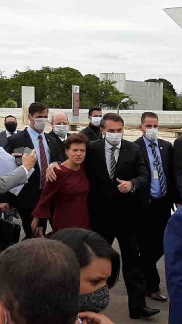 Enquanto marchava para o STF, Bolsonaro abraça uma senhora, mais uma vez descumprindo a recomendação de seu próprio ministério da Saúde. A foto é de hoje.